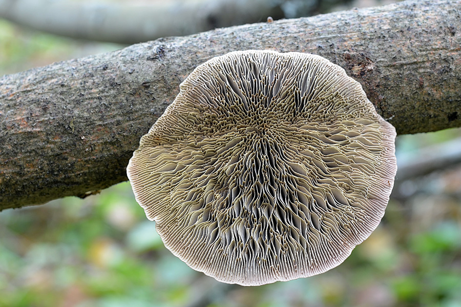 Грибы эти не редкость, но и не сказать что их очень много. Снимаю я их с большим удовольствием и уже не первый год. Встречаю я их на лежащих сучьях в орешниках и на упавших сухих ивах в низинных местах. Сверху гриб не интересный, просто лепешки на лежащих сухих сучьях, но если сук или ветку с грибом перевернуть, то взору открывается самый настоящий лабиринт грибных пластин.