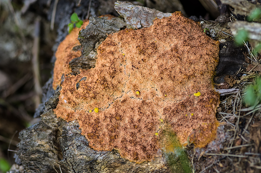 На старом трухлявом пеньке обнаружил такую красоту! Первое впечатление, что кто-то насыпал пшёнки для подкормки птичек!!!