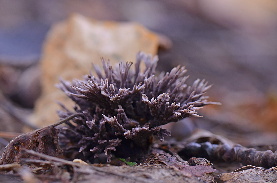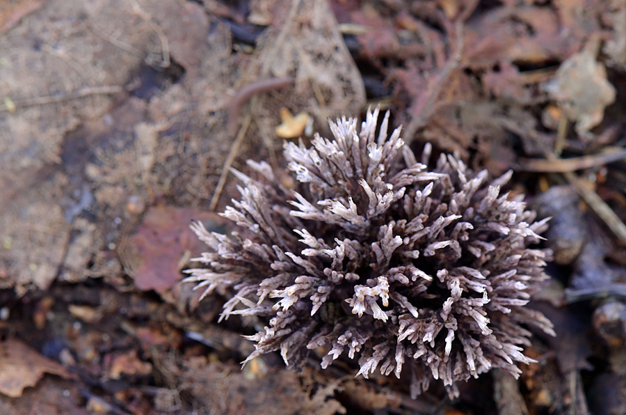Из прошлогодних почерневших листьев торчала странная кучка иголок по виду напоминавшая ежика. Серые иголки со светлыми кончиками действительно были похожи на иголки ежика. После сьемки с разных ракурсов я решился потрогать странную кучку. Слегка подергав понял, что в земле это сидит довольно крепко ,правда сильно дергать не стал. На ощупь напоминало грибы рогатики. Возвращаясь домой в другом месте на дороге нашел еще одну кучку ,но побольше разляпистую и не фотогеничную. Эту снимать не стал.