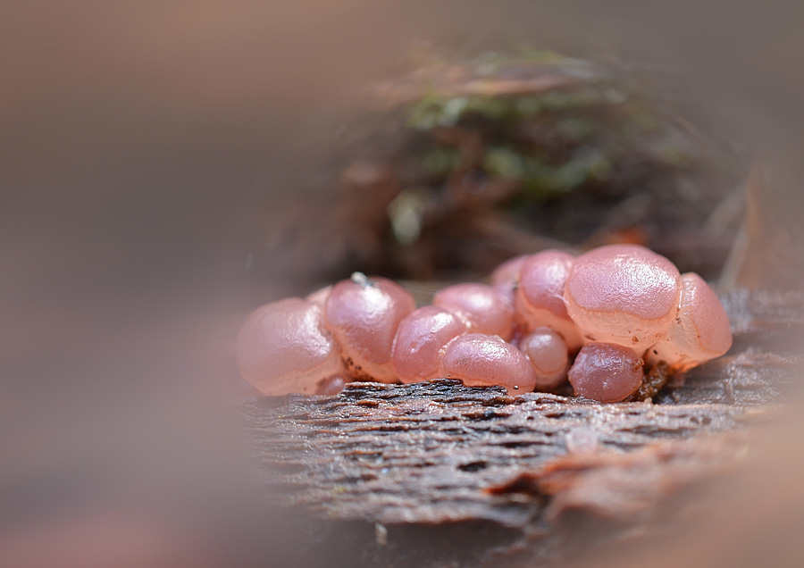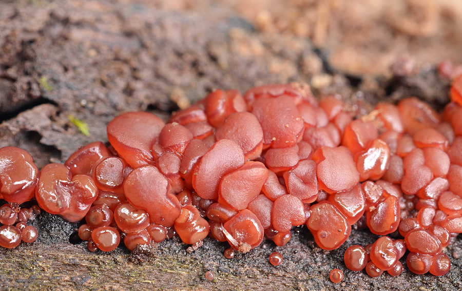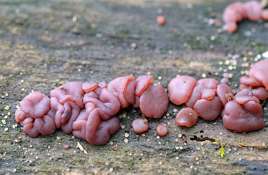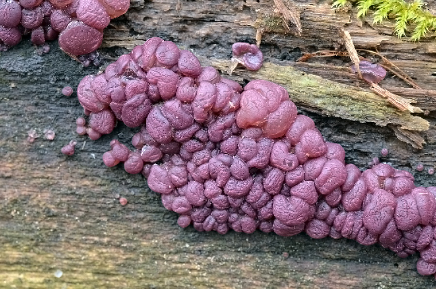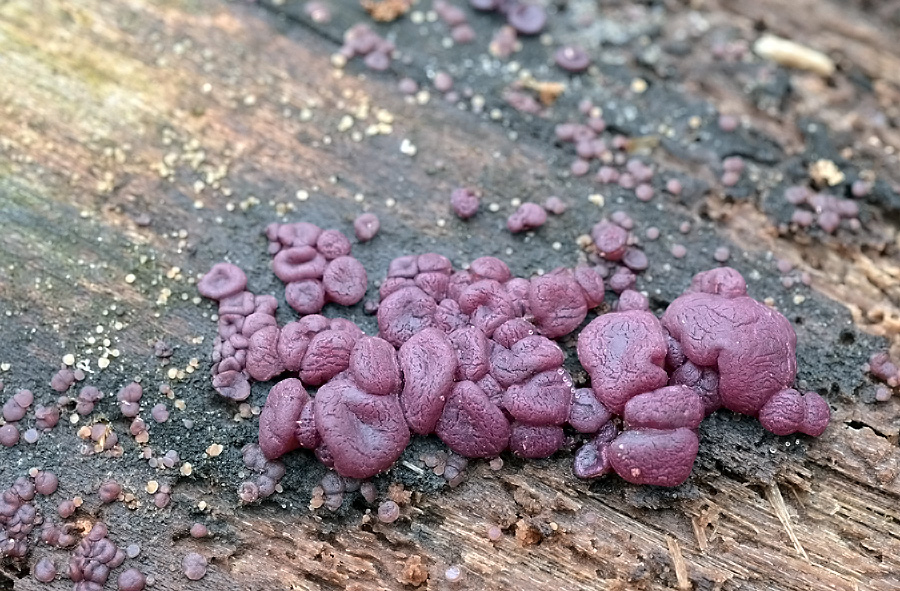 Это сумчатый гриб аскокорине мясная (Ascocoryne sarcoides). У этого гриба, как и у многих сумчатых грибов, имеется две формы (стадии) развития - несовершенная (бесполая), когда грибы продуцируют вегетативные споры, и и совершенная (половая), когда формируются половые споры. На бесполой стадии у аскокорине мясной образуются множественные плодовые тела (апотеции) мозговидной, лопастевидной или язычковидной формы и высотой не более 1 см. В половой стадии вырастают блюдцевидные апотеции диаметром до 3 см, обычно сросшиеся между собой, наползающие друг на друга. Цвет – от мясо-красного до лилово-фиолетового, насыщенный, яркий. Поверхность гладкая. Мякоть плотно-желеобразная.