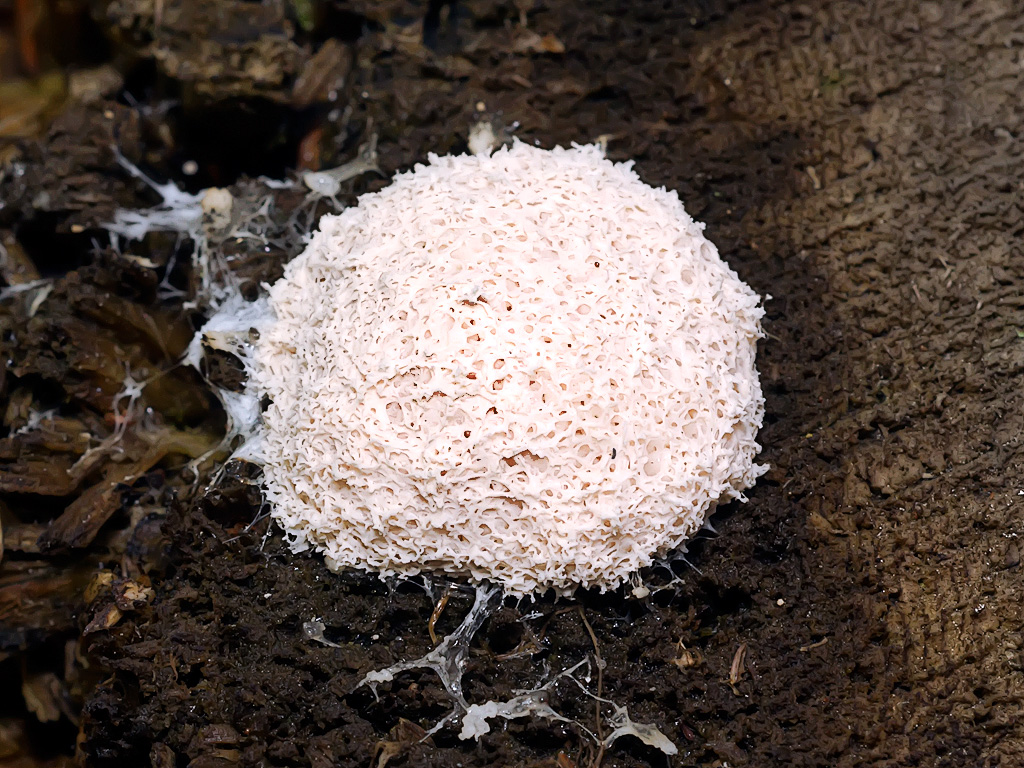 11 июля снял это "чудо", а 14 июля решил ещё раз посмотреть на него, но на пне, вместо красивого белого слизевика, оказалась чёрная слизистая масса, совсем неприглядного вида…