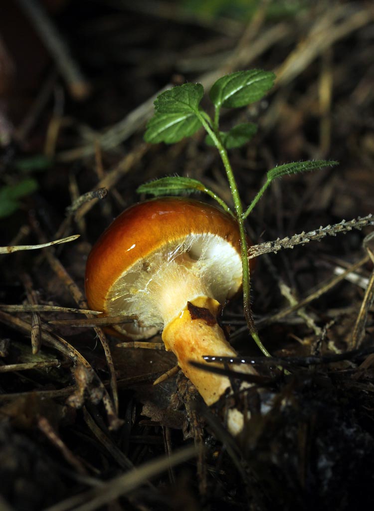 Limacella delicata вживую не видел. Но у знакомой мне лимацеллы капельной (Limacella guttata) у молодых грибов снизу шляпки имеется классическое покрывало, а не паутина, как у мокрух и паутинников.