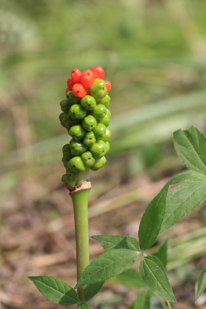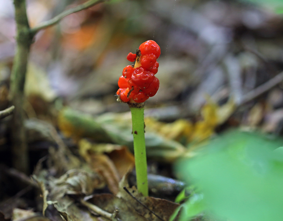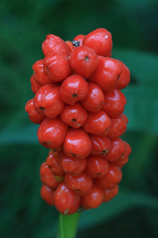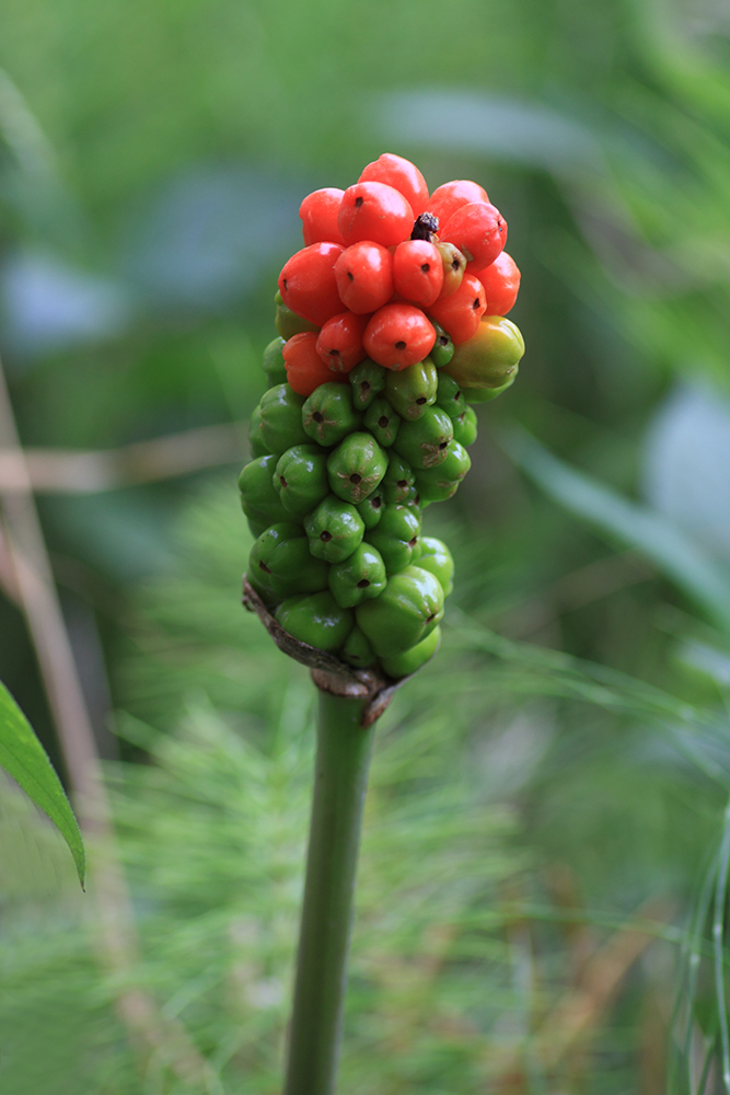 Аронник – достаточно необычное растение. Внешне очень похоже на канну с красивыми листьями и соцветием-початком. Особая прелесть аронника в том, что с середины лета его листья отмирают, оставляя лишь цветонос с ягодами.