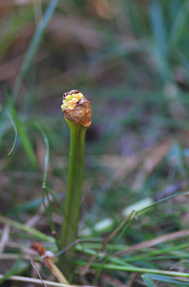 Когда растение перестаёт препятствовать насекомым выползти из трубки покрывала, оно вступает в мужскую фазу цветения и выползающие мухи собирают на себя созревшую пыльцу.