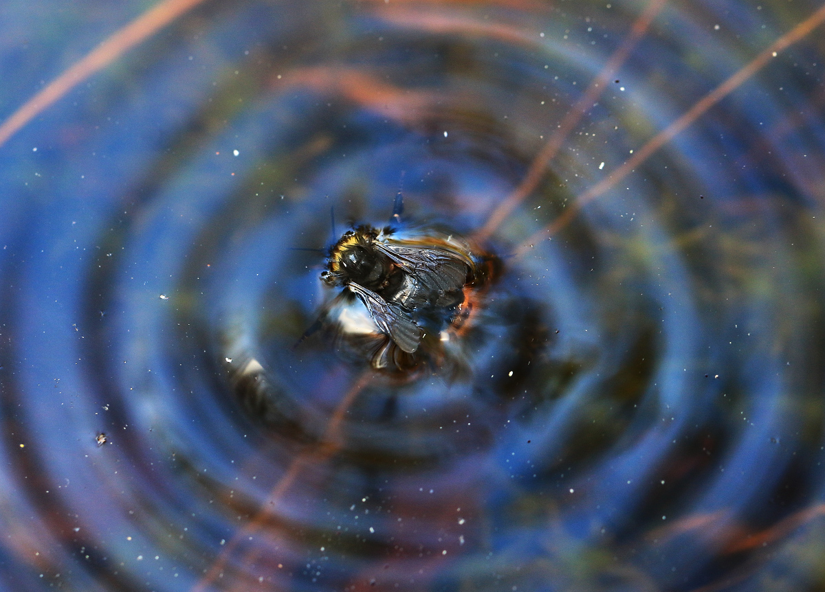 Случайно увидела периодически возникающие круги на поверхности лужи в залитом половодьем лесу. Думала, что водомерка. Но оказалось, что то ли муха, то ли пчела. Тонет, пытается выбраться. Затихнет - на воде штиль. Пошли колечки по воде - снова делает попытку. Пришлось исполнить роль деда Мазая.