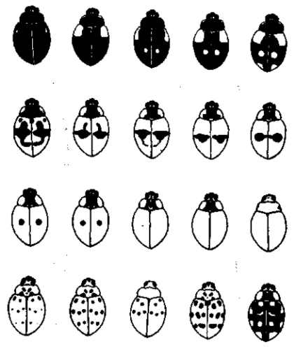 Гетероморфизм окраски у божьей коровки Adalia bipunctata. Изображены только гомозиготные формы. По Я. Я. Лусу, 1932