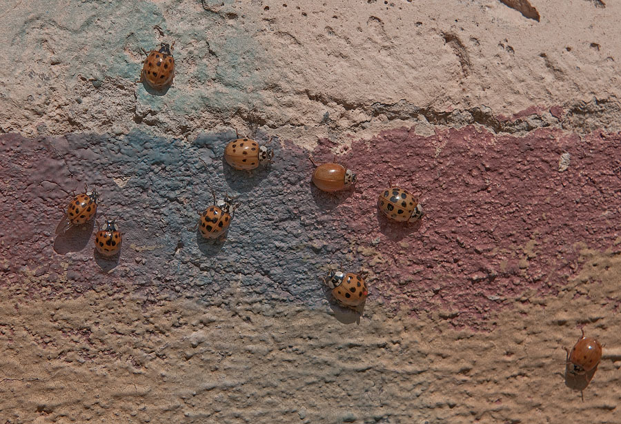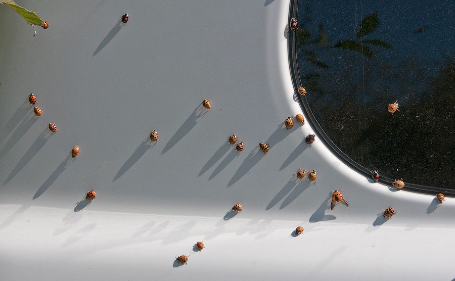 вчера выходила из дома,всё было чинно-благородно,в лесополосе встретила одну- единственную божью коровку,а на обратном пути было просто невозможно спокойно зайти в подъезд,летящая орда металась,суетилась,сбивала с ног,без разбора облепляла всё на своём пути,остановилась на минутку,чтобы снять это безобразие,позаползали за шиворот,чуть фотоаппарат из рук не выдернули,:)масса "приятных" ощущений... На улице +20,делаем вывод,что скоро приморозит,раз началось нашествие..
