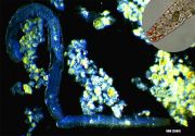 Так выглядят клетки репчатого лука. Красно-коричневые точки - это ядра клеток. Снято двумя объективами "в связке" (Сигма + Гелиос). Под школьным микроскопом всё это выглядит, конечно, покрупнее.