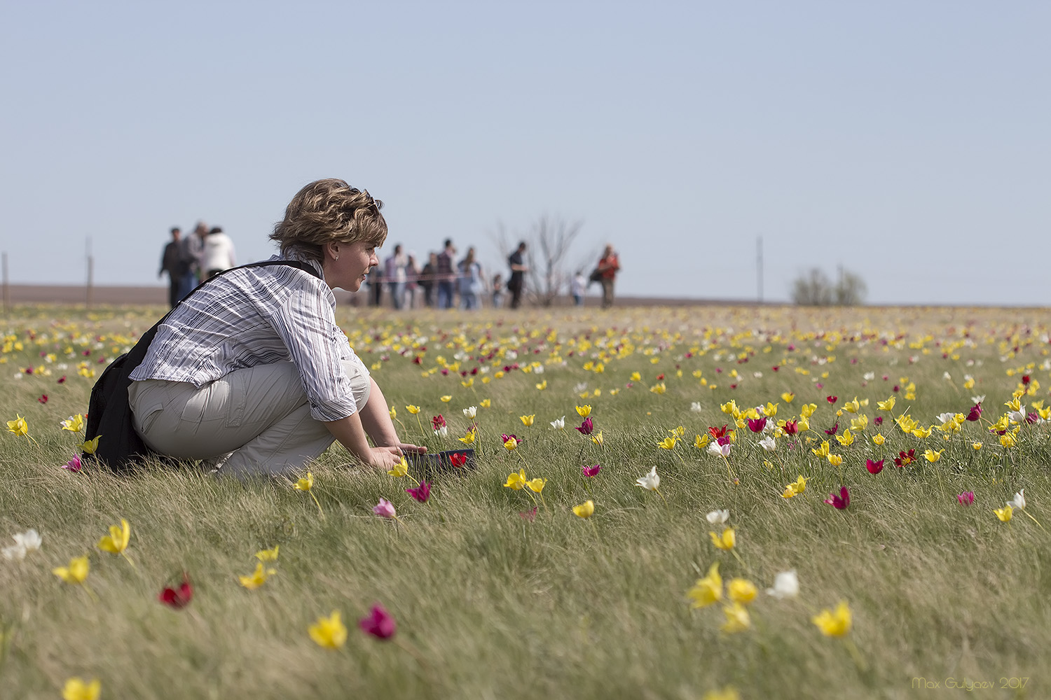 Не смотря на дороги, до цели мы добрались вполне благополучно. Полюбовались сказочным видом небольшого участка цветущей степи. А цвела она всеми цветами радуги, которые выдавали небольшие, но яркие тюльпаны Геснера. Удивительное зрелище. Поснимали красоту и двинулись обратно, по пути сворачивая к местным водоёмам. Женя хотел найти кого-нибудь из семейки земноводных или пресмыкающихся...