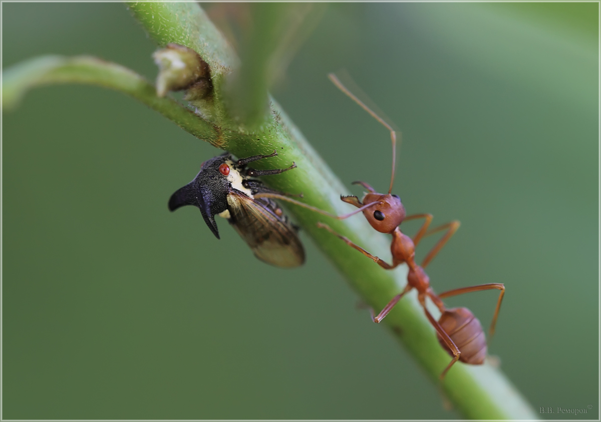 Любая классификация несовершенна. Вот и эту серию одинаково можно бы разместить и в Равнокрылых (цикадки) и в Перепончатокрылых (муравьи). А еще бы лучше - Симбиоз или Мутуализм, но таких категорий нет