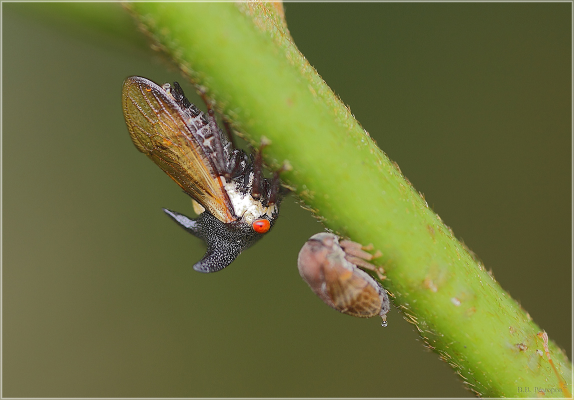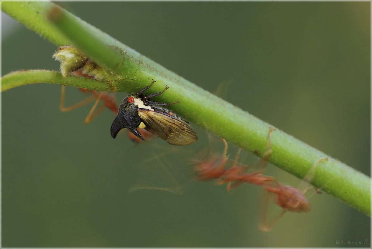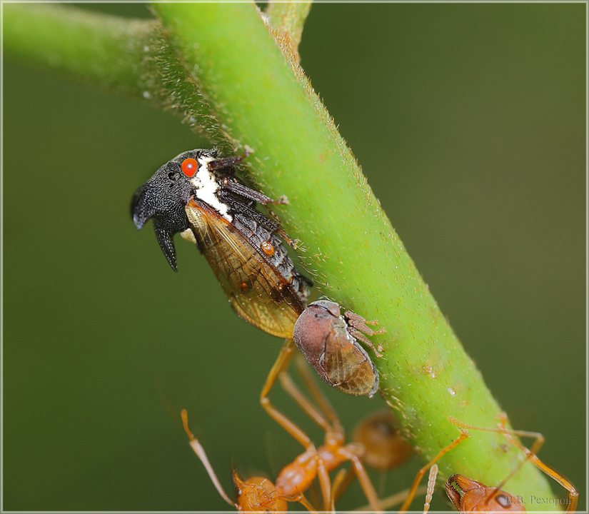 Цикадка (горбатка?) сидела на ветке куста рядом с деревцем Artabotrys (http://macroclub.ru/gallery/showphoto.php/photo/98059/ppuser/5474/cat/500) и вокруг суетились рыжие муравьи. Собственно, их скопление и привлекло мое внимание.