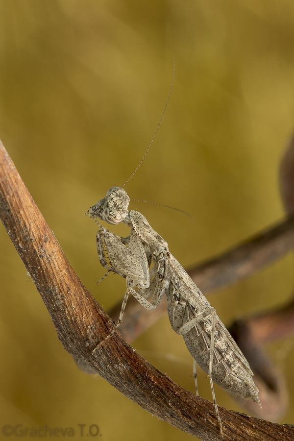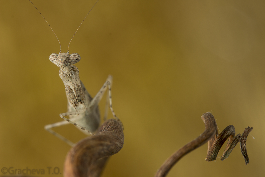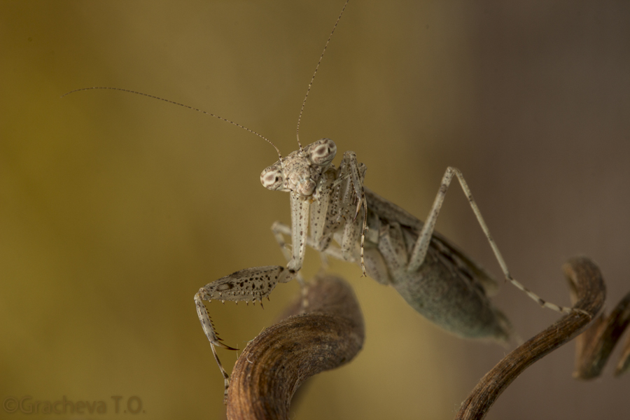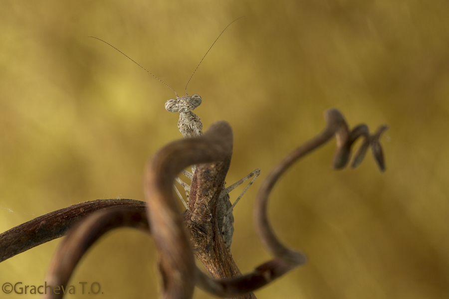 Знатоки помогли определить - это Armene pusilla, богомол-крошка. Уже взрослая особь, а такая маленькая. Ну точно - кроха. Очень редкий вид, оказывается.