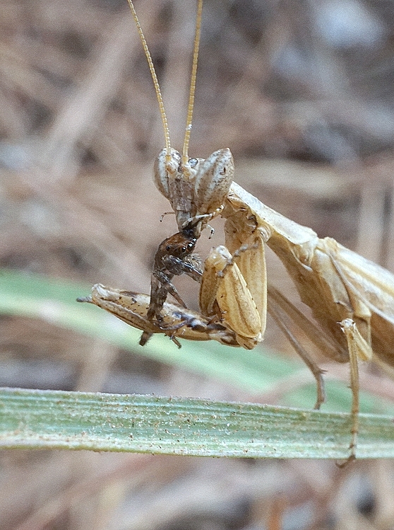 Вспомнил одну историю, которая тоже связана с тем, как и что богомолы едят. У одной моей знакомой был сын, которого она воспитывала в соответствии со своим образованием (молекулярный биолог, правда впоследствии он стал матемaтиком, побеждая на многих математических олимпиадах). У них жил дома в большой бутылке богомол. Кормили они его кузнечиками. Из их наблюдений выходило, что начинал он есть кузнечиков всегда с головы. Он хватал его одной из передних лапок, и повернув её так, чтобы голова кузнечика была на уровне рта, откусывал её. И так было всегда. Но однажды богомолу бросили акриду. Он схватил её, как всегда, поперёк тела. Повернул к себе одним концом, потом повернув на 180 градусов, поднёс к себе другим концом, потом повернул обратно и поворачивл её так несколько раз. Затем, поглядев укоризненно на маму с сыном, выбросил акриду и отвернулся. Потом в течение несколькиз дней богомол вообще ничего не ел. Видно сильно обиделся. Пришлось выпустить его.