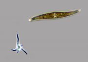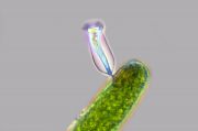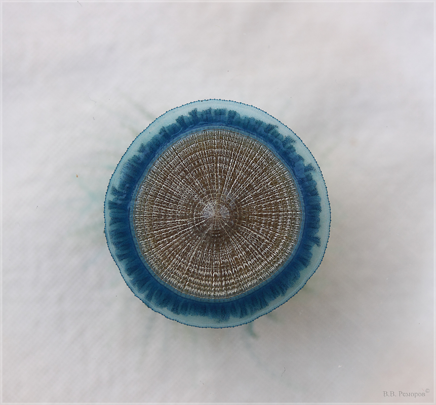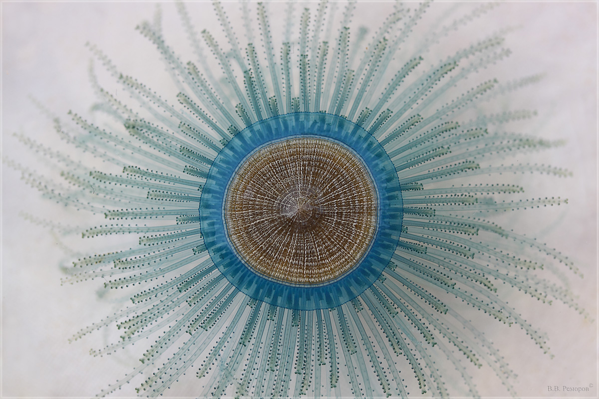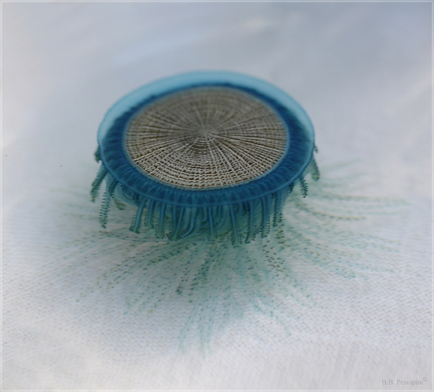 Во время купания в море наткнулся на кусочек чего-то, принятый мной за какой-то бытовой мусор. Кусочек имел вид небольшого диска, по краям которого радиально торчали сине-зеленые волокна. Мне это напомнило часть капронового ершика для мытья лабораторной посуды. Мало ли всякой дряни оказывается в море. Однако через пару минут я увидел еще пару таких, а потом еще ...