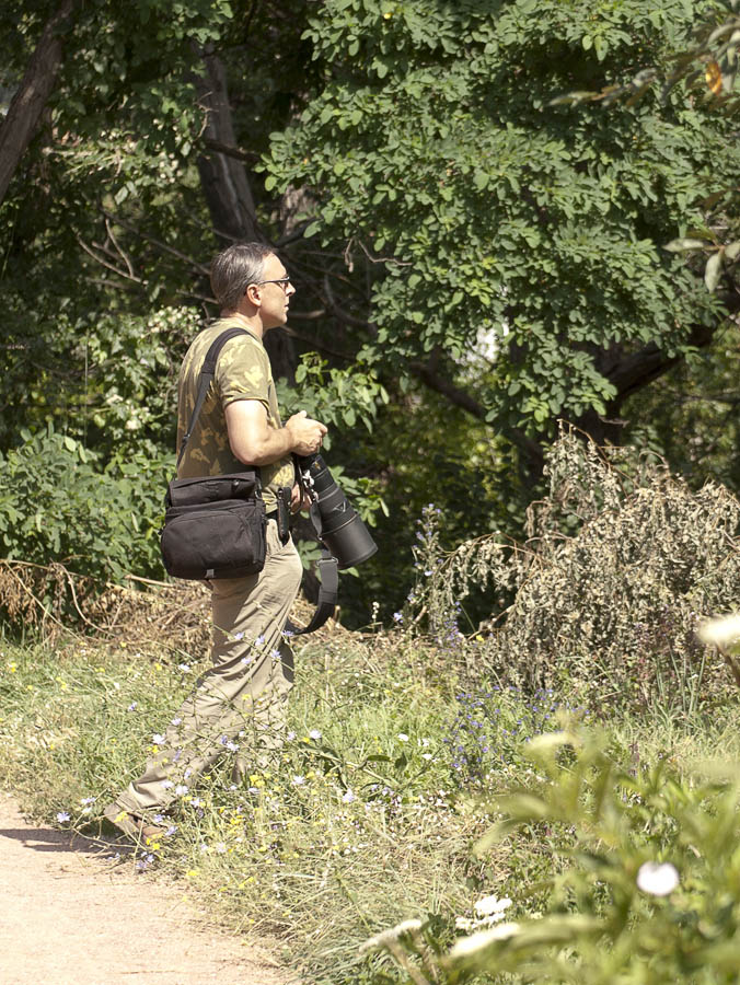 Наверное,любой настоящий фотограф похож на глухаря на току-увлеченный съемкой,он видит только объект и никакие препятствия ему не помеха.Так и здесь-несмотря на близость тропинки в парке,по которой часто проходили любопытствующие отдыхающие горожане,Владимир сосредоточенно занимался фотосъемкой..