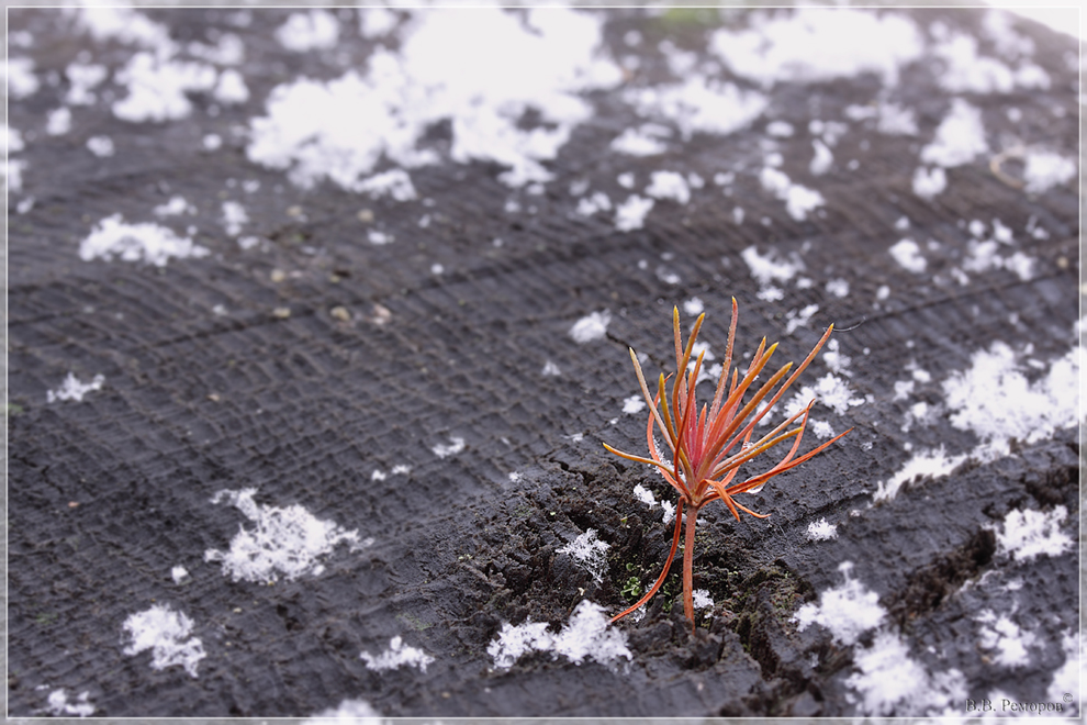 Понимая, что дней для съемки становится все меньше, отправился к заветной сосне с самого утра, до работы. Полчаса, как рассвело, небо затянуто, ветер. Вдобавок полетели белые мухи.