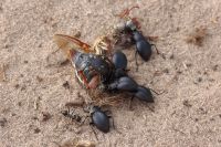 Что до странных на первый взгляд пищевых пристрастий чернотелки, то все в пределах нормы. Блапсы, а на снимке прдставитель рода Blaps, могут быть некрофагами В Каракумах видел как чернотелки ели мертвого удавчика.