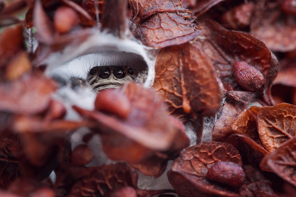 На самом деле в конце лета я как-то нашел кокон паука-скакуна и самку в нём. Один из них был вот так открыт и я случайно заметил что там кто-то бегает. Оказалось самка имела два открытых входа, через один из них я и снимал её. На том же растении были еще два кокона, таких же паучков, одна из них потом вышла, поскакала и снова забралась внутрь.