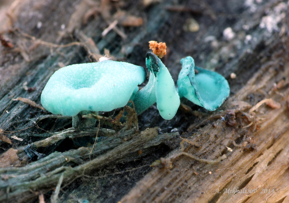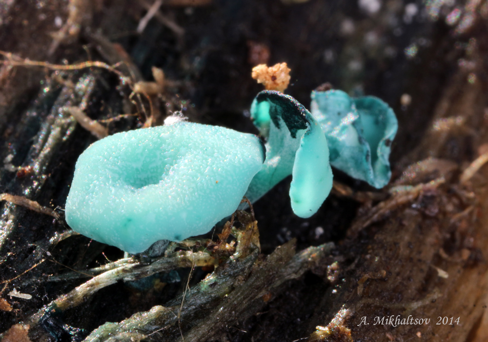 Естественно, планировали поиск макрообъектов. Удалось найти не совсем засохшие апотеции дискомицета Хлороцибория сине-зеленоватая (Chlorociboria aeruginascens). Диаметр самого крупного плодового тела 5 мм.