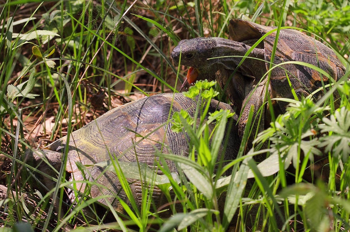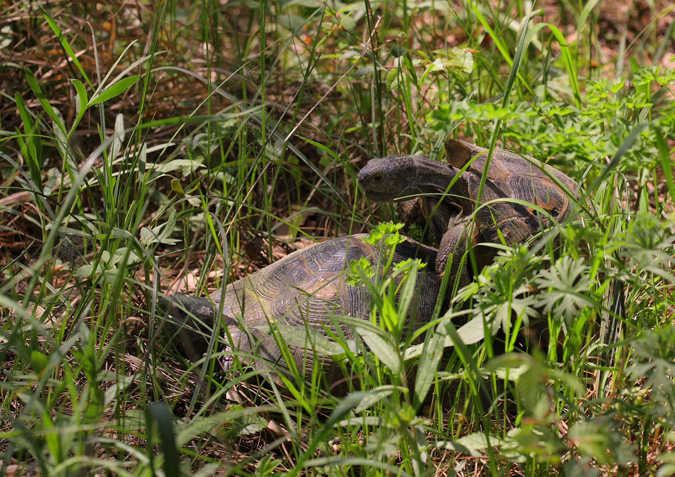 Этих черепах я и не нашел бы, но явственные глухие удары камня о камень заставили меня свернуть с лесной тропинки. В нескольких метрах от тропинки, в траве, я увидел этих любовников. Самец с разгона ударял нижним краем панциря ("грудью") по панцирю самки. Наверное, возбуждал в ней ответное чувство! Smile Мое появление немного смутило их, они притихли и самка зарылась головой в траву. Самец тоже чуток убавил пыл. Я почувствовал себя лишним на этом празднике и, сделав несколько кадров, ретировался, о чем сейчас жалею. Smile