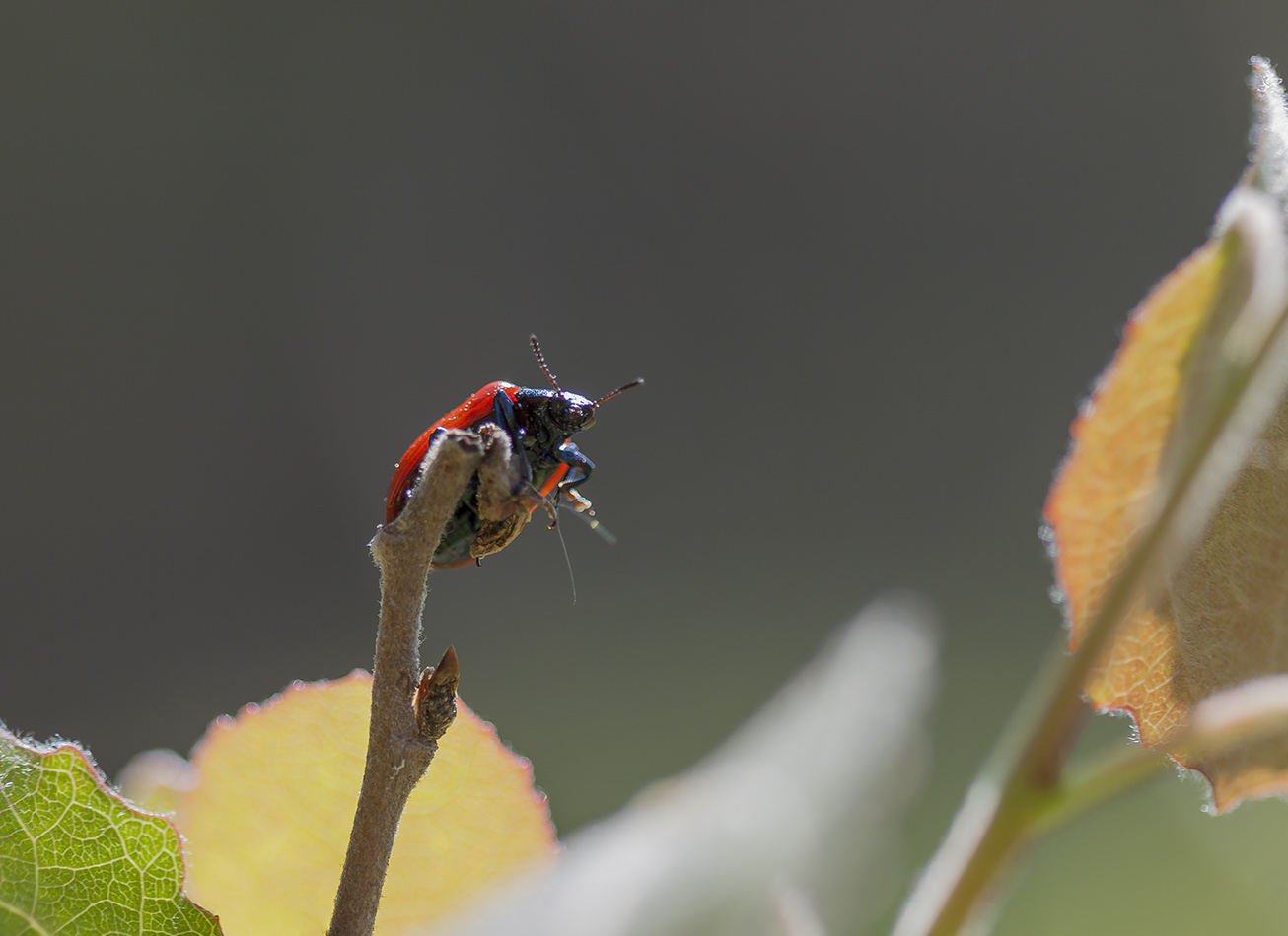 Листоед Chrysomela (populi или tremulae?) беспокойно вертелся на веточке ...