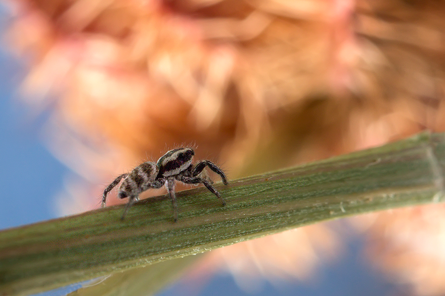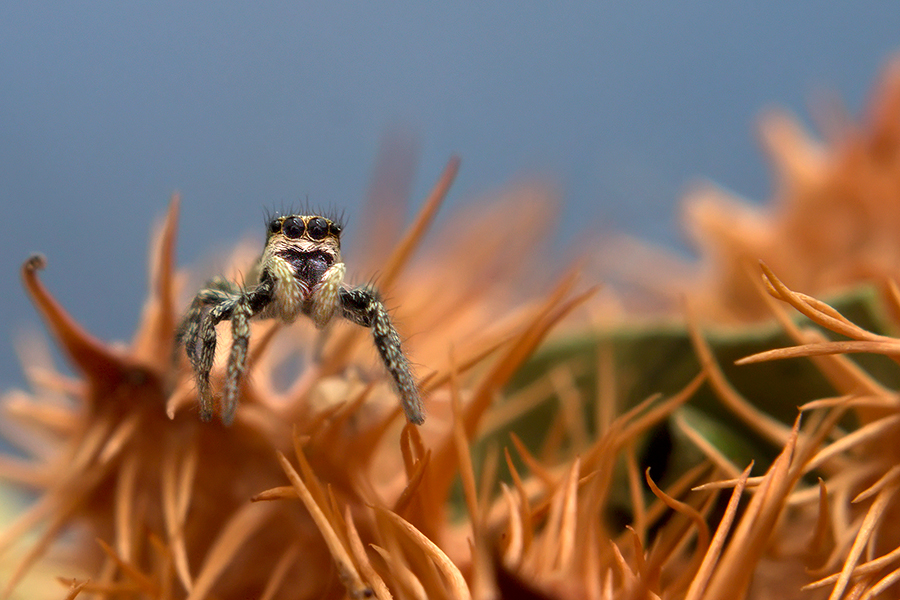 В эти выходные решили съездить в загородный дом, с прошлого года там не были. Приехали, включили обогрев, и через некоторое время буквально на голову приземлился паук. Очень маленький милашка. Ему была предложена фотосессия, от которой он не смог отказаться. То, что это тот самый паук-скакунчик, которого мне ни разу не довелось еще увидеть, я поняла только после того, как сделала пару кадров. Эти огромные глаза в 3 ряда. Как же я обрадовалась. Фотосессия оказалась длиннее, чем было ему обещано. Очень непоседливая модель. И маленькая - 4 мм. О рейноксе или линзе даже и не думала. Интересно, он вырастет или так и останется маленьким?