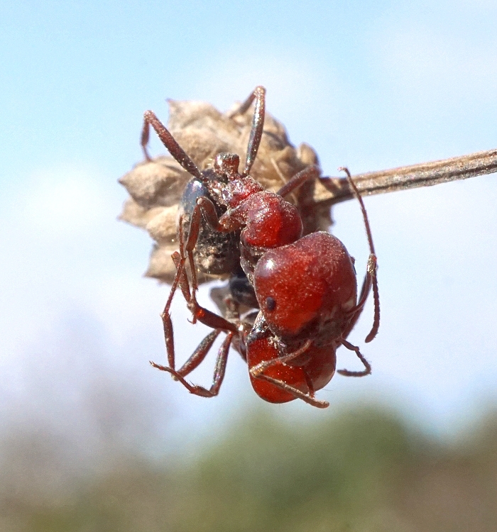Пол-часа ждал, когда закончится эта драка двух муравьёв, в которую не вмешался ни один из пробегавших мимо муравьишек, а их было немало, т.к. драка происходила на их трассе. Драка была интенсивная в жару на прямом солнце. Я-то уже сильно вспотел, только наблюдая, и не понимал почему она не прекращается. Решил подробно разглядеть. Может один зажал лапу другого в челюстях и, не сильно сопротивляясь, ждал пока тот обессилит. Подсадил эту свору на Яффскую головчатку...дальше смотрите фото... А потом они свалились и я их больше не видел...