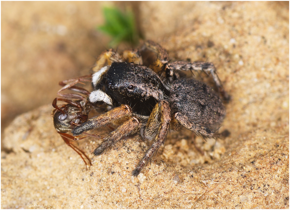 Вышел на часок на облюбованную полянку, где очень много колоний роющих ос и пчел. Но погода не заладилась, набежали тучи. И активности ноль. Только где нигде недружелюбные взгляды из норок. Но потом встретился среди домиков паук, потом еще и еще. И получилась охота не на пчел а на пауков.