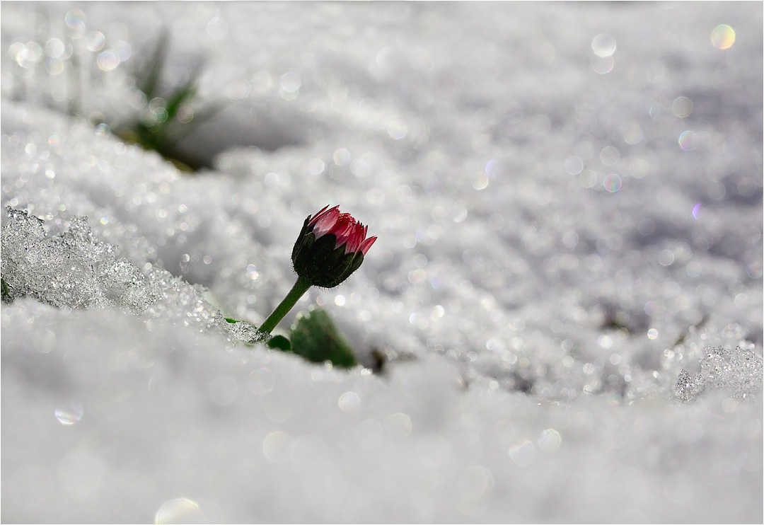 Fotosniper: Жестокие манеры природы! Такую красоту хотела опять под снегом спрятать. На мой взгляд, очень правильно выбрана плоскость резкого изображения. Боке своей игрой со светом действительно отлично украсили весь снимок.Единственное, что я позволю себе посоветовать, это убрать эту травинку, которая настойчиво старается увести взгляд из кадра. Но это уже придирки!