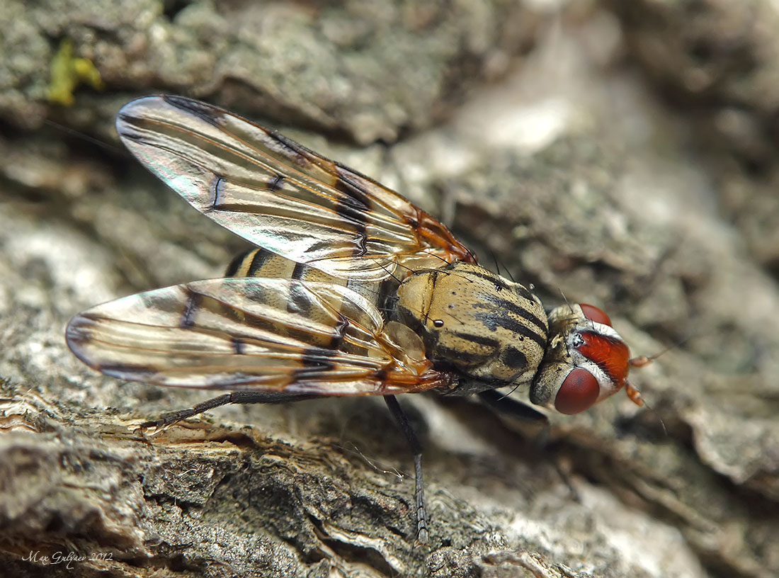 Я бы сказал, что она из семейства пестрокрылок, Tephritidae. Что-то типа Sphenella или Tarellia. Такой именно вроде не нашёл на диптере...  Нет, не хлоропида и не тефритида! Другое семейство: надо смотреть в улидидах...