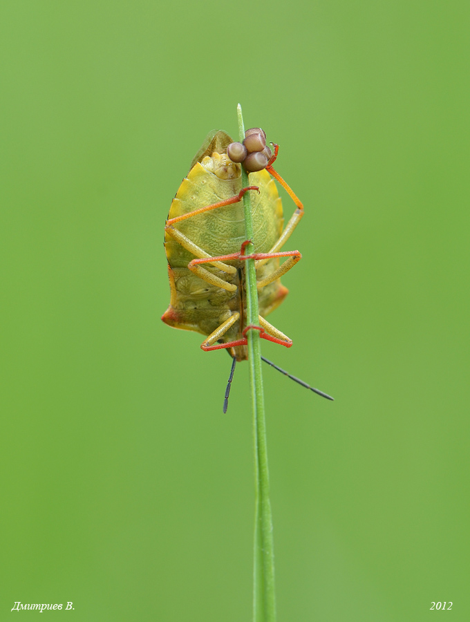 Наблюдал как клоп по одному яйцу клеит на стебель.