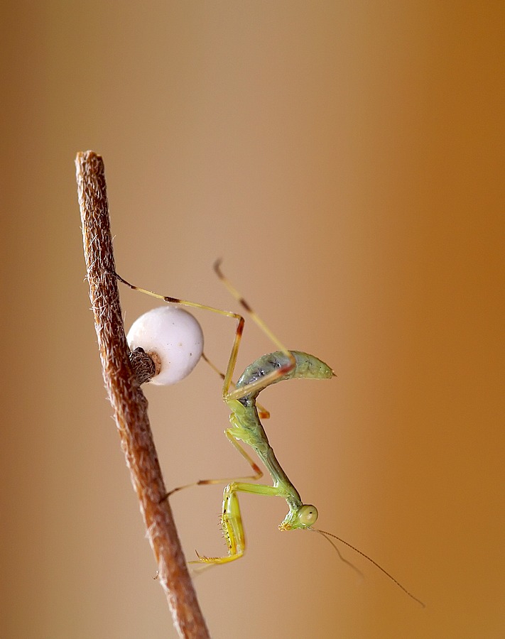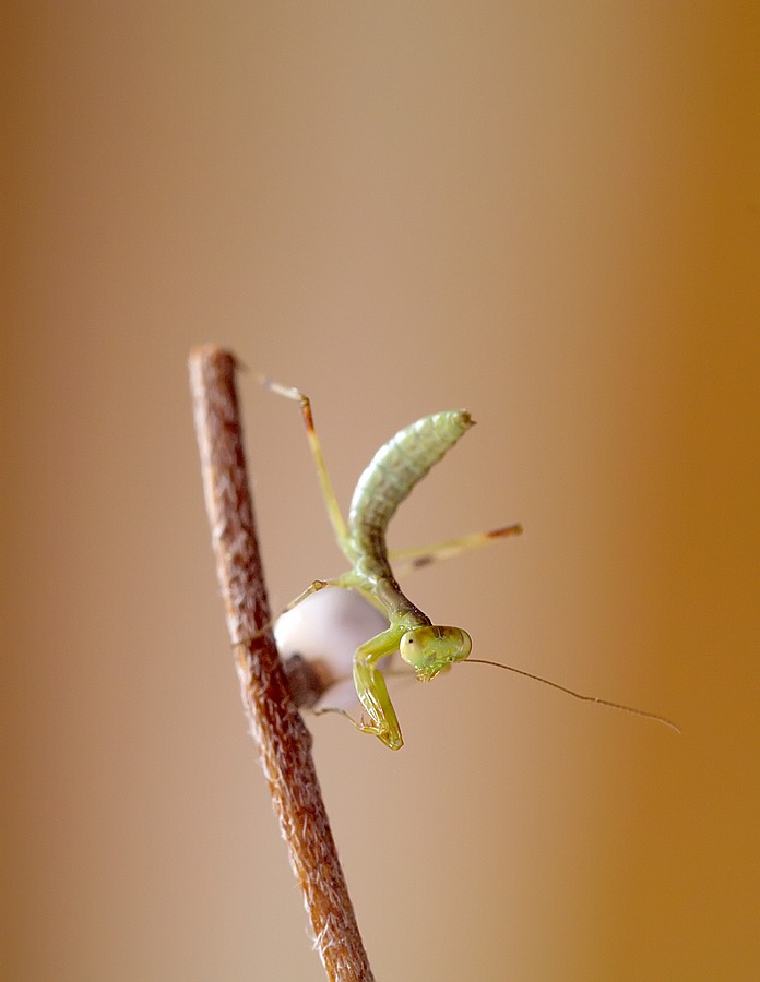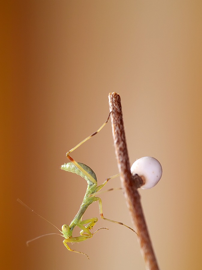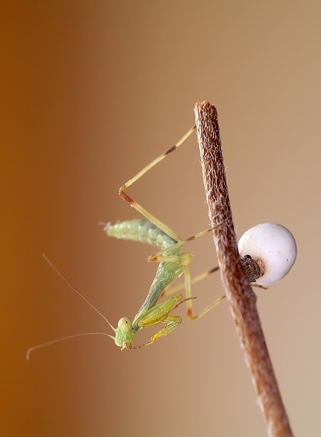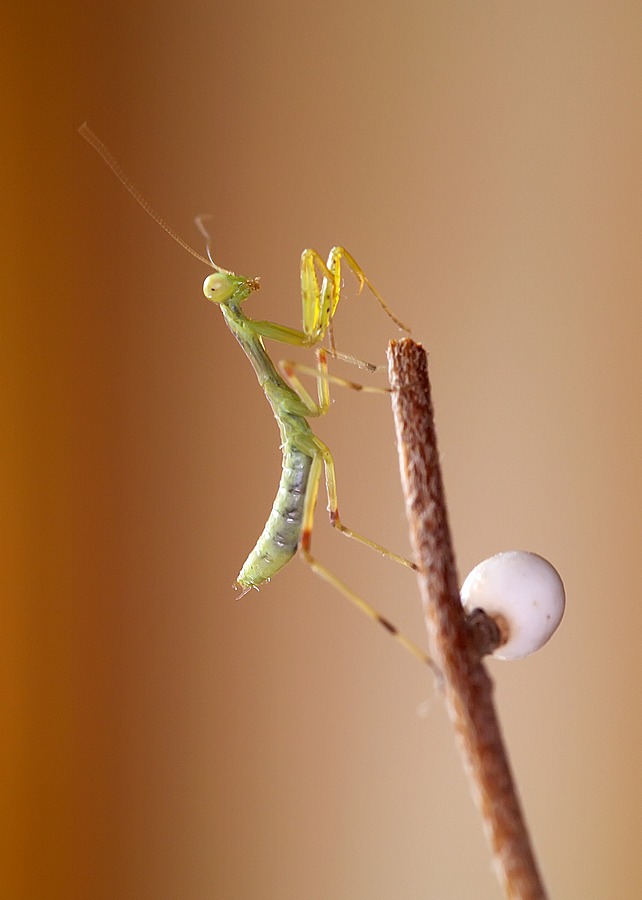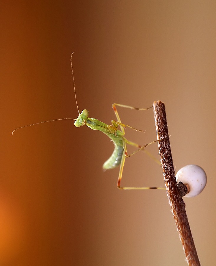 Обнаружил на окне этого маленького богомольчика. Как он попал на третий этаж, я не представляю. Попробовал поснимать. Вот что получилось.