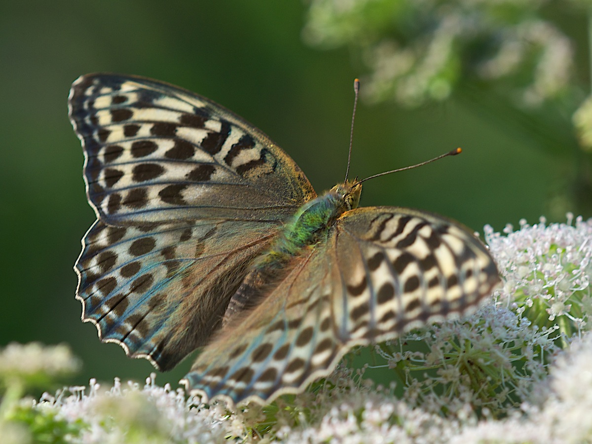 На фото 1-3 самец, на 4-7 самка Agrynnis paphia. На фото 4, самка рыжего окраса, на 5-7 зеленоватого. Зеленоватая разновидность встречается гораздо реже, но именно она кажется мне наиболее интересной:-)