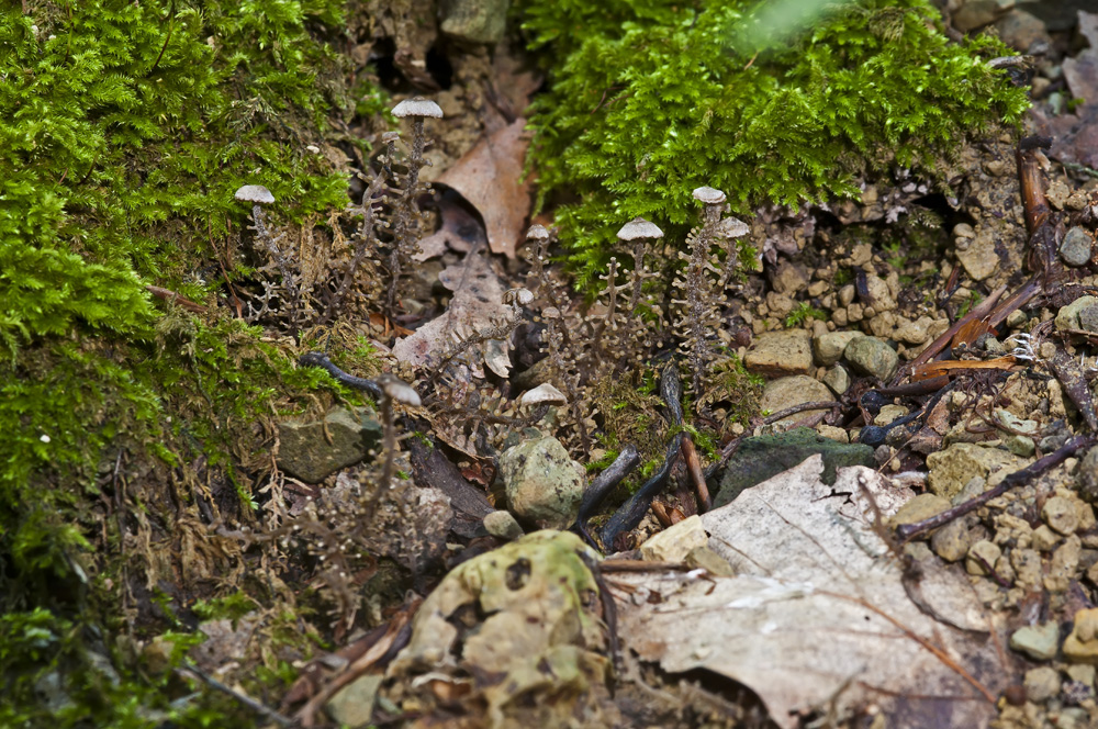 Сегодня, во время тихой охоты были замечены странные объекты на склоне горы. Размеры 2-2,5 см в длину, диаметр шляпки 2-3-3,5 мм. Росли небольшими групками по несколько особей. Я вдел всего 2 группы.