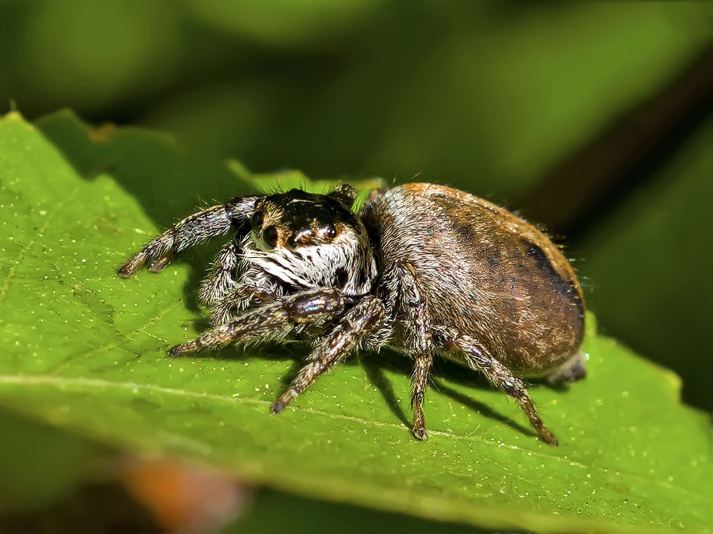 Этот паучок привлёк моё внимание тем, что был размером около 7мм. Таких крупных скакунчиков я ещё не встречал. Снимать было неудобно, так как он находился в тени и мне одной рукой приходилось держать ветки что бы до него добраться.