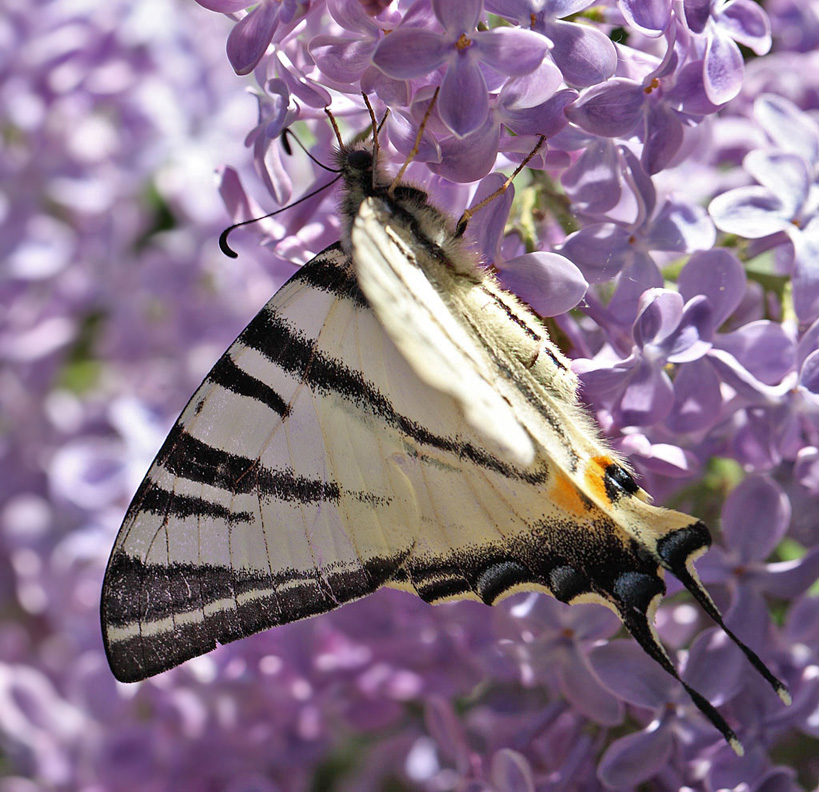 Мой первый и единственный подалирий. Когда встретил в начале июня на сирени-глазам не поверил. Сделал около 120 кадров, но ни одного удачного. И неудивительно - снимал почти в обед, вовсю светило жесткое солнце. Да и садился он довольно высоко. Но факт есть факт - они у нас есть!