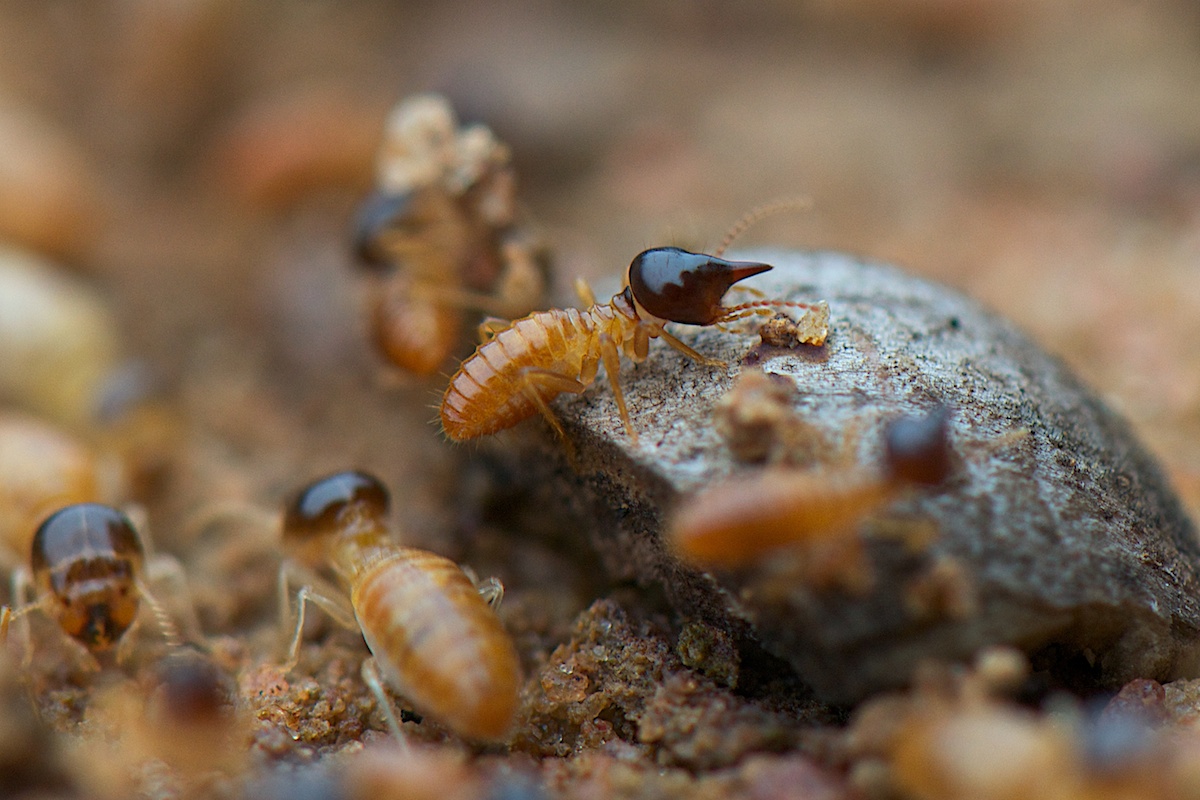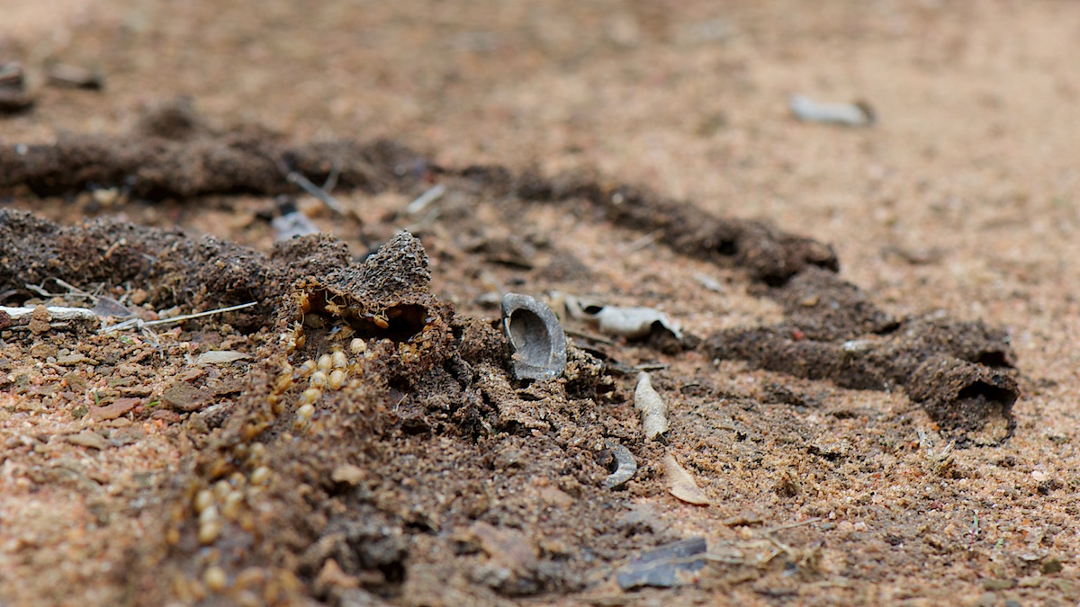 Термиты очень чувствительны к изменениям погодных условий, поэтому большинство видов термитов живет в "помещениях" с искусственным климатом, который они создают не только в жилищах, но и в закрытых галереях, которые проложены к местам питания. Одну из таких галерей мы и обнаружили в парке Ноэль Кемпф во время выхода в лес. Галерея пересекала лесную тропу и была довольно незаметной. Ночью же прошел очень сильный дождь, и когда на утро, мы пошли по той же тропе, то обнаружили, что потоки воды разрушили стены галереии и тайная жизнь термитов стала явной :-)) Наблюдать за ними было очень интересно, солдаты, головы которых были увенчаны "рогами", выстроились вдоль разрушенных стен галереии, приготовившись отразить любую возможную атаку, внутри же галереи рабочие термиты собирались в группы и в сопровождении других солдат быстро перебегали открытое пространство. Такие "конвои" формировались достаточно часто и двигались в обоих направлениях. Рядом с разрушенной галереей термитов находился вход в муравейник и муравьи куда то спешили по своим делам, им часто приходилось пересекать термитную галерею, причем старались они делать это особенно быстро, дабы не получить заряд клейкой защитной жидкости, которой "стреляли" солдаты из своих "рогов".
