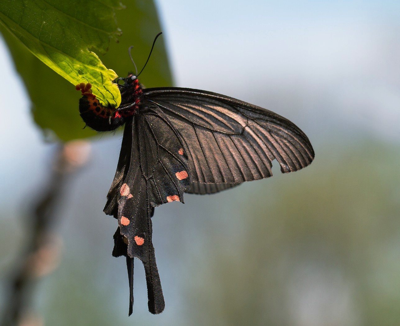 Процесс откладывания яиц самкой алциноя на листья кирказона