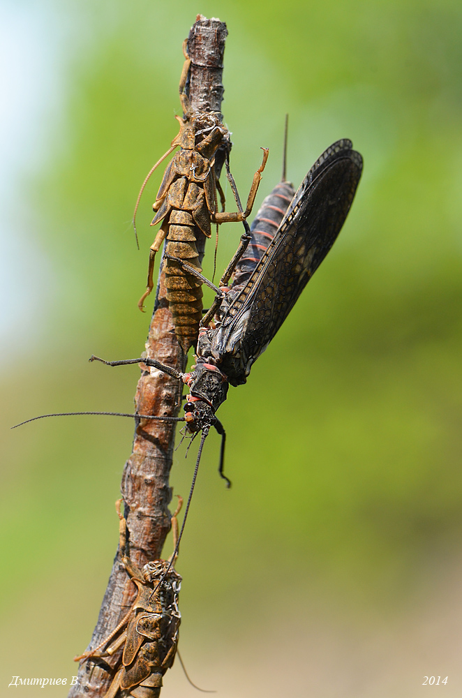У меня нет никакого стекинга. Веснянки подпускают к себе довольно близко, можно даже в руки взять, если есть желание. Так, что их можно фотографировать любым объективом. Главное попасть в такой момент. Я третий год пытаюсь увидеть как они выползают из воды..., и никак. Вот только уже последние моменты метаморфоз.