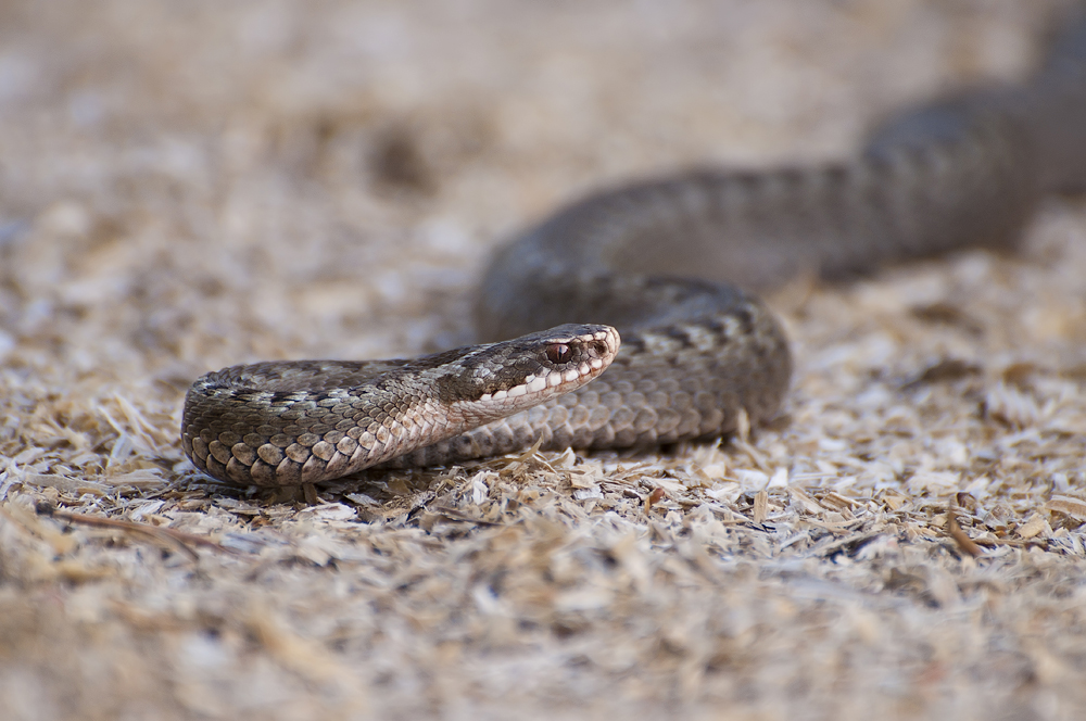 Ну вот, это моя первая встреча со смеёй. Что самое интересно, много лет ходил влес, специально искал их, чтобы сфоткать, но момента подходящего небыло ... а тут на тебе, стал возвращатся к машине с утренней съёмки, это было в июле, смотрю шланг лежит на дороге и шипит )... вау думаю, круто ... сейчас пофоткаю ... а змейка то выползла на солнышко на опилки греться (у нас лыжная трасса вся опилками завалена) ... ну вообщем она разрешила мне себя поснимать, хоть и угрожала )