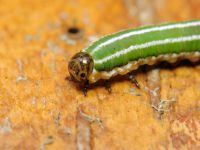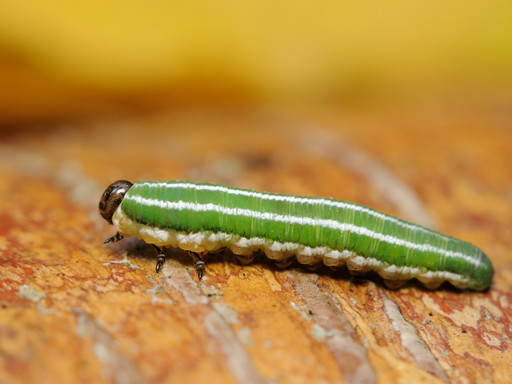 Эту лжегусеницу пилильщика (вроде бы это Gilpinia hercyniae) нашёл на пеньке, фотографируя миксомицеты. С невзрачного пенька перенёс на берёзовую кору (на ту сторону, которая была обращена к стволу) и пожелтевшие листики положил для фона.
