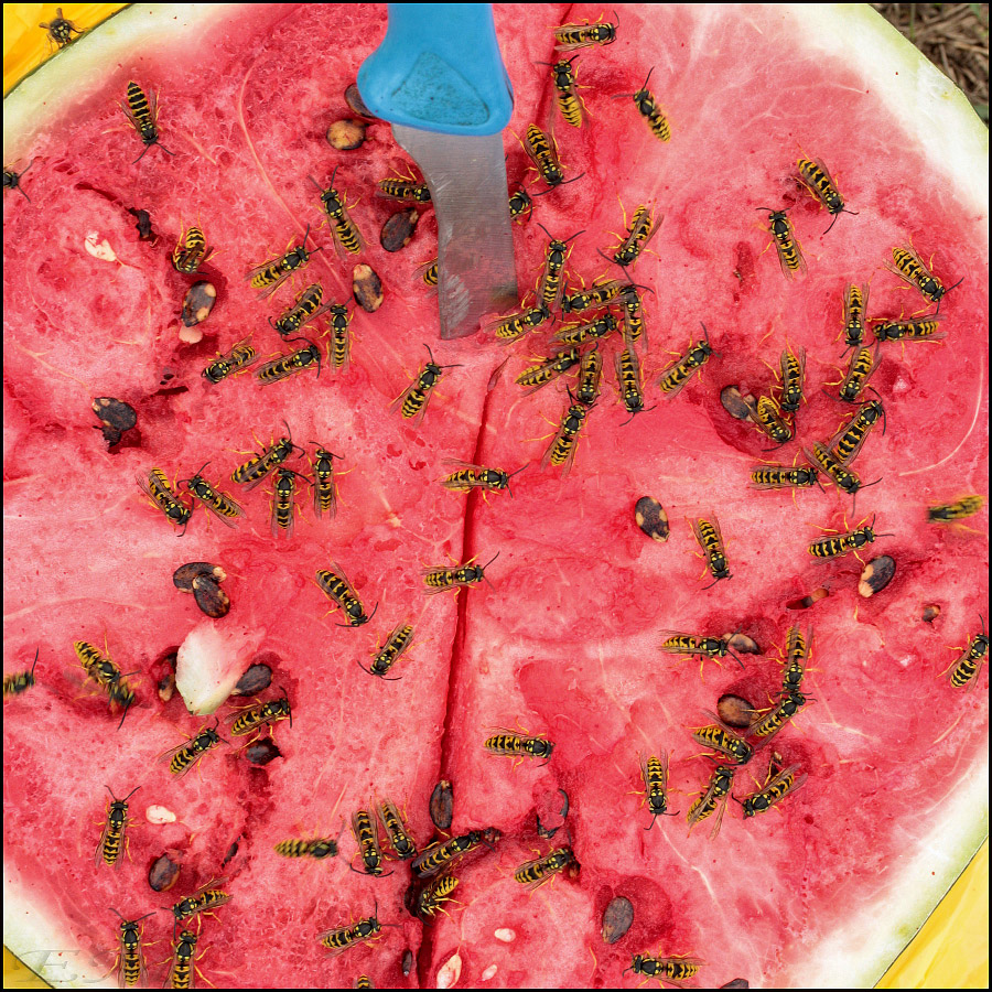 На арбузе (1.1, 2.2) - Vespula germanica. Судя по количеству и неконфликтности, где-то рядом было гнездо, и это всё сёстры.