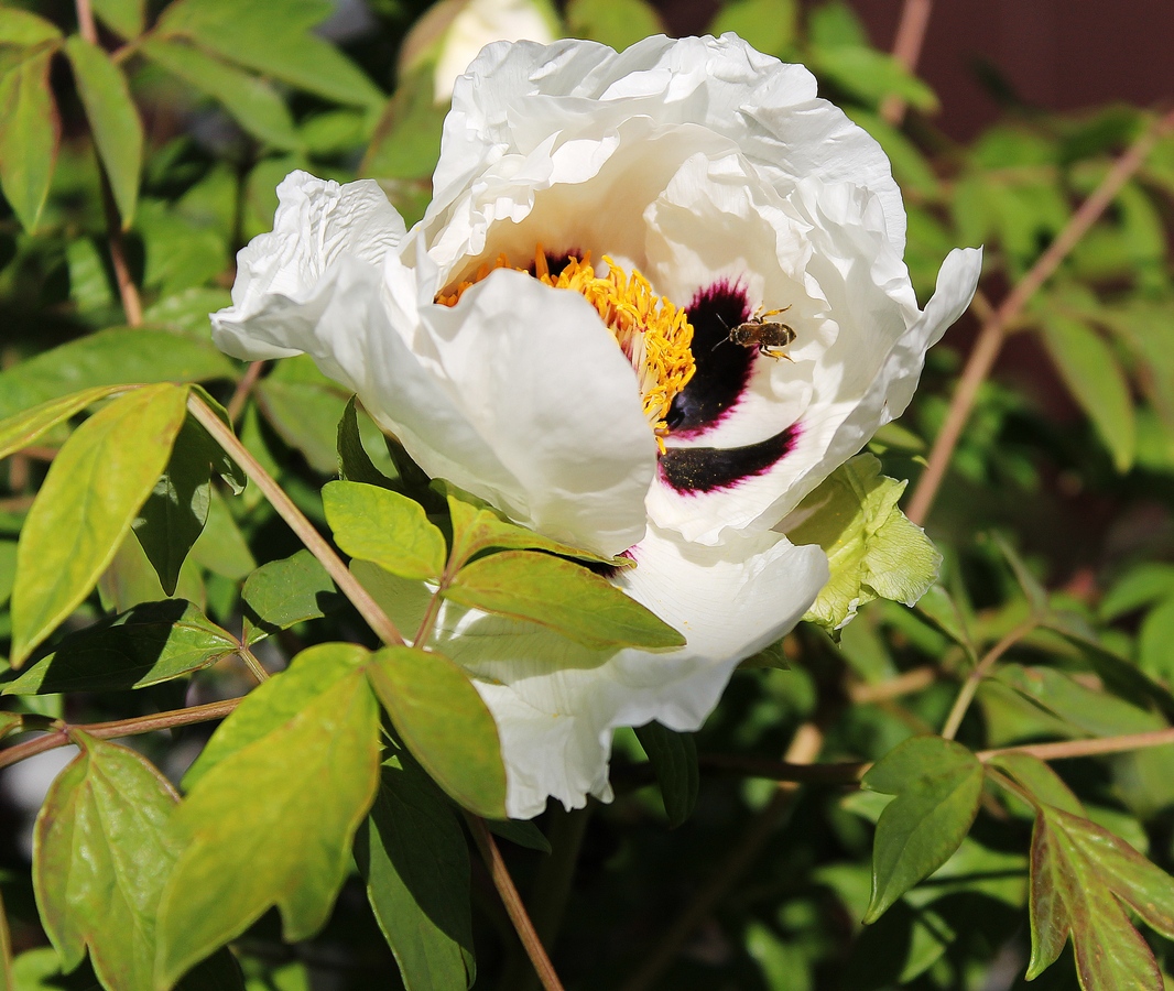 Весна пролетела стремительно. Вслед за первоцветами, магнолиями, сиренью и тюльпанами зацвели древовидные пионы. Любуясь ими, обнаружила, что, оказывается, даже среди цветов одного куста нет равенства. Роскошных белых цветков было множество, их изредка и довольно вяло навещали одинокие пчёлки. Причём это относится как к распахнутым во всю ширь , так и к полураспустившимся, с ещё измятыми лепестками (вот как на первом фото, где пчёлка неторопливо собирает свой ещё тощий взятОк в корзинки на задней паре ног).