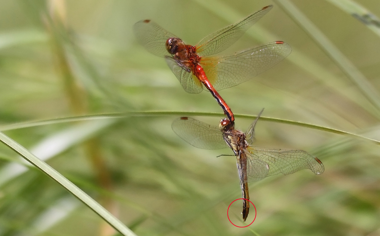 Поведение настоящих стрекоз при откладывании яиц в мелкую воду и на мокрый берег я наблюдал в самом конце августа прошлого года и описал его здесь: http://macroclub.ru/gallery/showphoto.php?photo=144107 и здесь: http://macroclub.ru/gallery/showphoto.php?photo=144207 . В этом году в том же месте, но на 2-3 недели раньше я наблюдал почти такое же поведение настоящих же стрекоз, но, кажется, другого вида. Стрекозы летали не над водой, как в прошлом году, а над зарослями осоки. Пары стрекоз совершали пируэты между куртин осоки, но также залетали и непосредственно в гущу стеблей и листьев. Самцы таскали за собой самок, бросались вниз, а потом взмывали вверх, а брюшки самок чиркали не по води или мокрому субстрату, а по листьям осок. Каков смысл в таких движениях? Можно было бы предположить, что самки приклеивают яйца к травинкам, но, кажется, это не так (фото 7 и 9).......