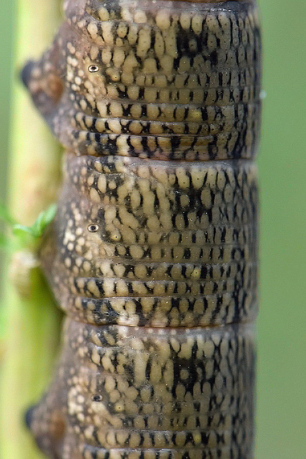 Здорово! Это гусеница среднего винного бражника, а те две маленькие были, скорее всего, гусеницами малого винного бражника. Они очень похожи, но размер разный.