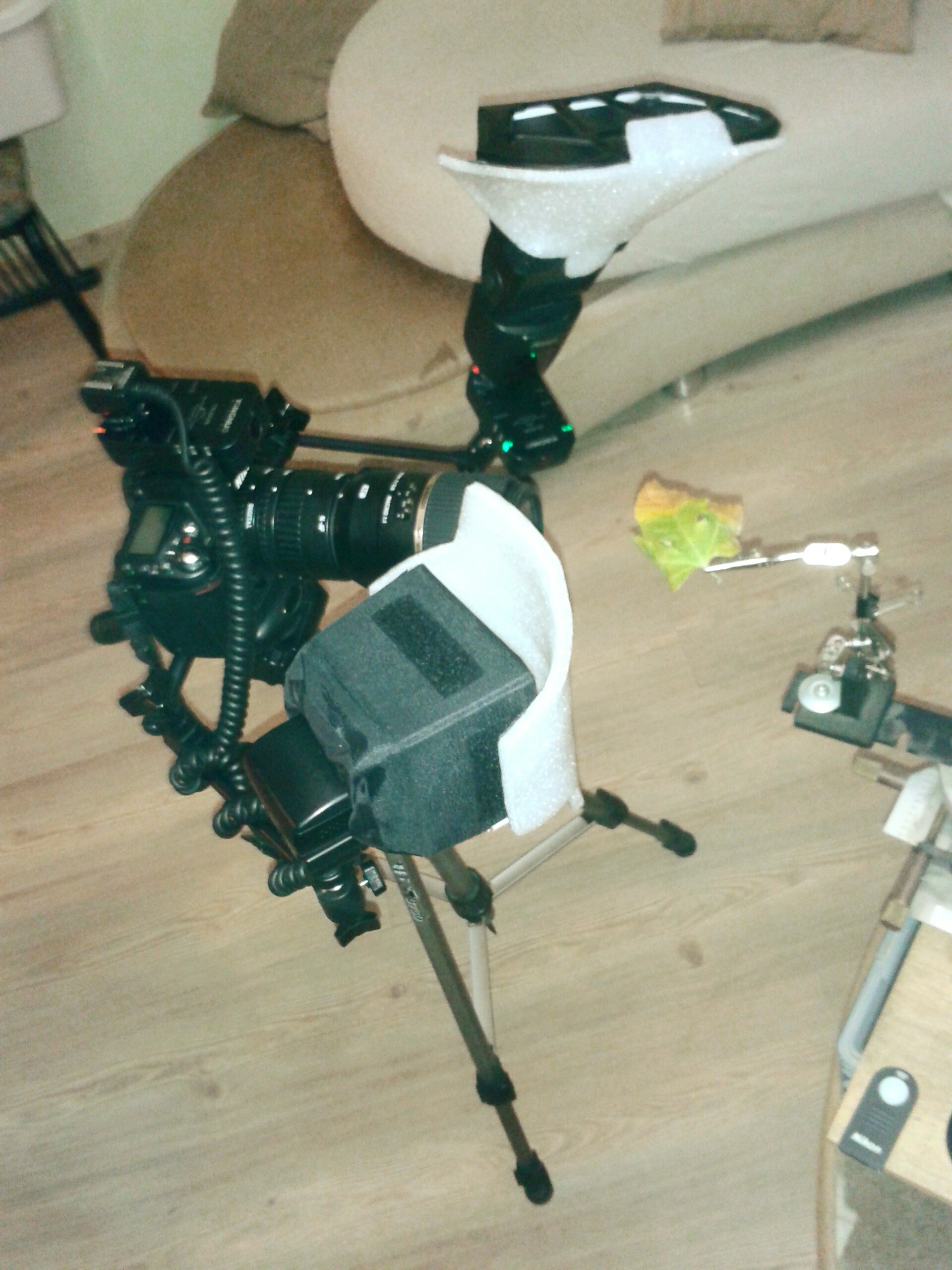 Отражатели - куплены на Ebay. Один - 10х10 см, для маленькой вспышки, а второй - так называемый "80×20". Обе вспышки направлены на отражение. А вот рассеиватели - как и у Вас, из изолона (толщина варьируется от освещения), который крепится на предварительно приклеенные "липучки" (кстати, "липучки" очень рекомендую - оперативно, удобно и надежно). Сейчас хочу проэспериментировать с нетканым белым полотном.