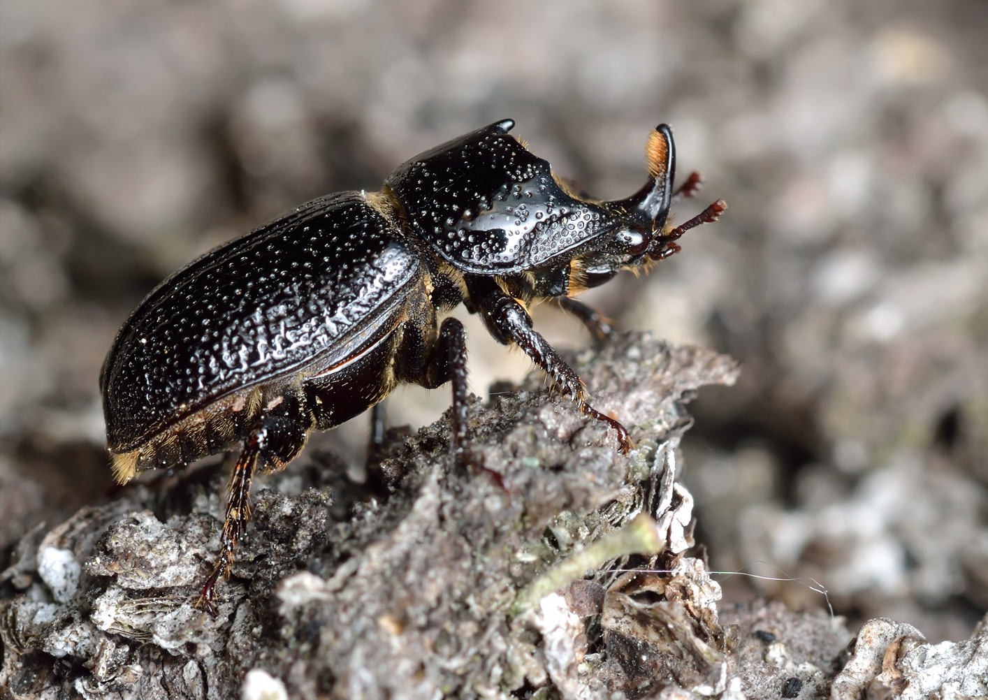 Жук длиной 9—16 мм. Чёрный, иногда чёрно-бурый, блестящий. Тело удлиненное и сильно выпуклое. Половой диморфизм проявляется в строении рога на голове: у самца рог крупный, у самки — небольшой, развит на лобном шве.