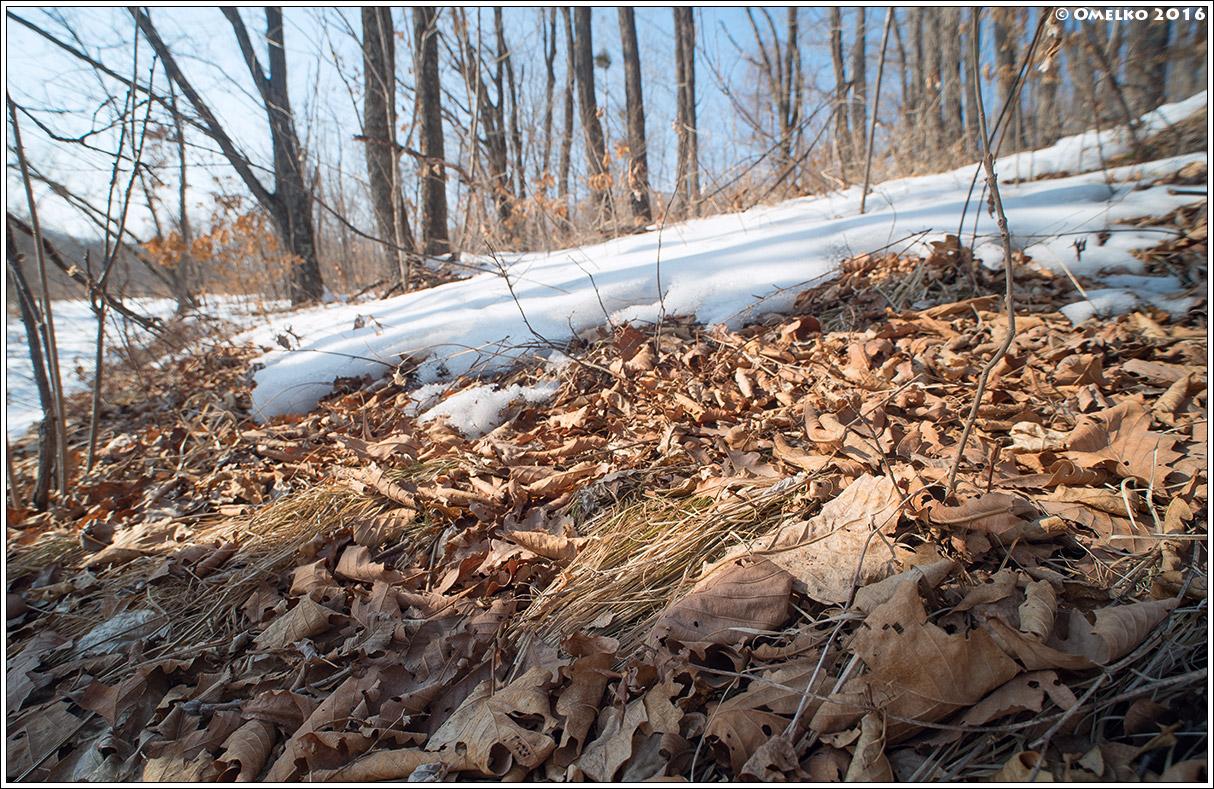 Для меня, как макрофотографа, весна наступает не по календарю, а в тот момент, когда появляется первая беспозвоночная живность. В этом смысле весна в Приморье все-таки уже началась, хотя календарь и показывает зиму. Южные склоны сопок начинают оттаивать, обнажая лиственный опад. Слой сухих прошлогодних листьв кажется мётрвым, но на деле жизнь здесь уже кипит.