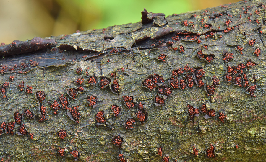Neonectria coccinea (синоним - Nectria coccinea). Довольно редкий сумчатый гриб.