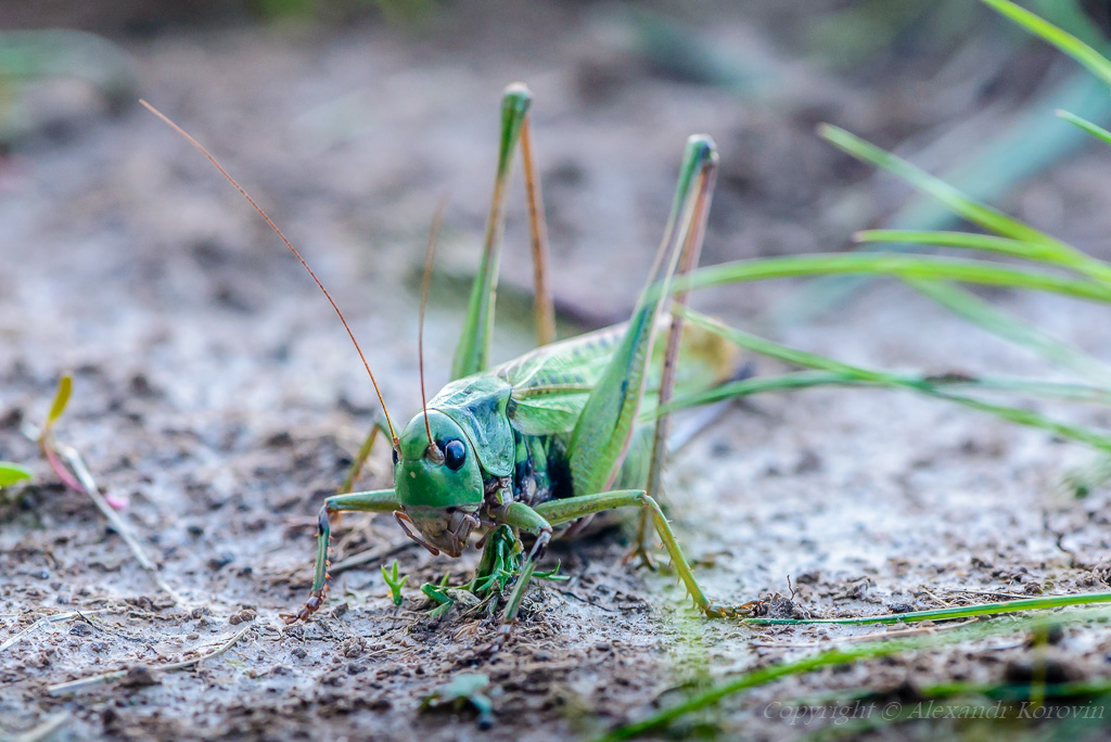 Самка кузнечика певчего. Удалось близко подобраться, когда она остановилась передохнуть на небольшой прогалине.